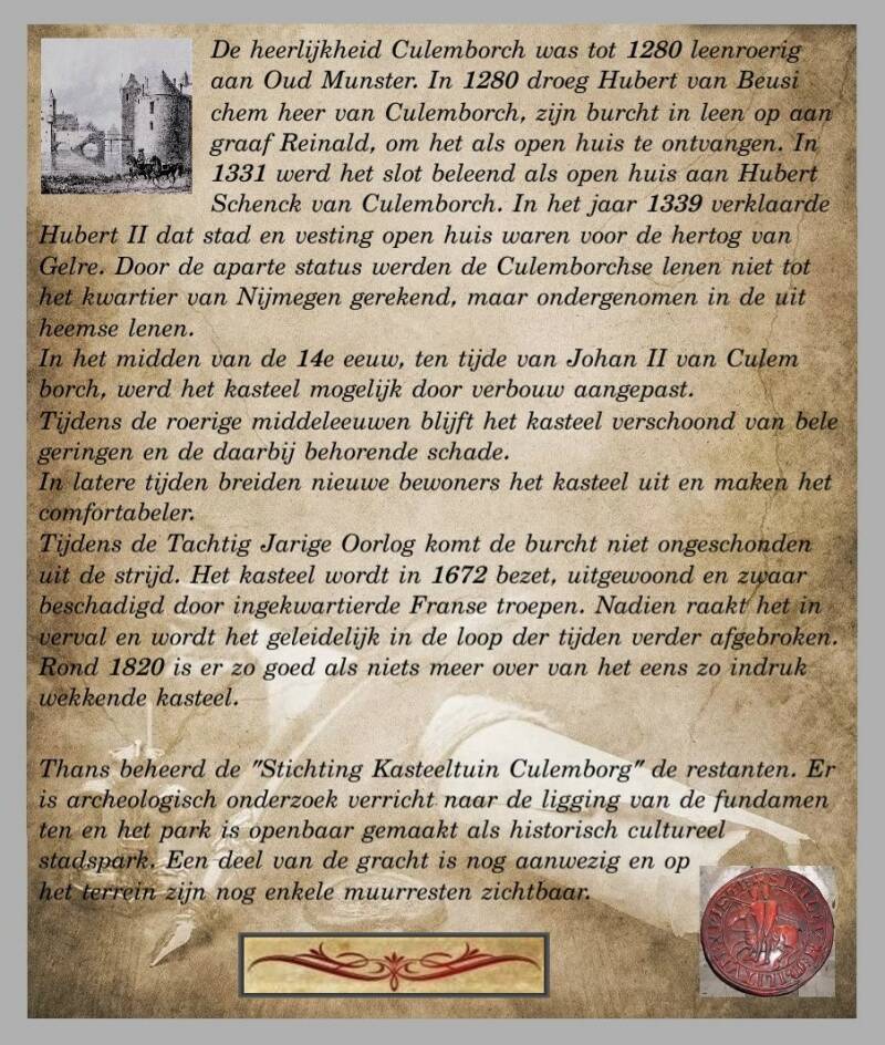 Kasteel Culemborg - Gesticht eerste helft 14e eeuw - In 1735 en 1812 (definitief) gesloopt - Beheer: Stichting Kasteeltuin Culemborg.