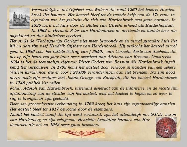 Kasteel Hardenbroek - Gesticht ca. 1260 - Henriette Arnoldine barones van Hardenbroek-Snouck Hurgronje heeft het kasteel na haar overlijden in 1994 nagelaten aan haar zoon jhr. mr. Francis Loudon die het thans nog bewoond - Landgoed is gedeeltelijk toegankelijk