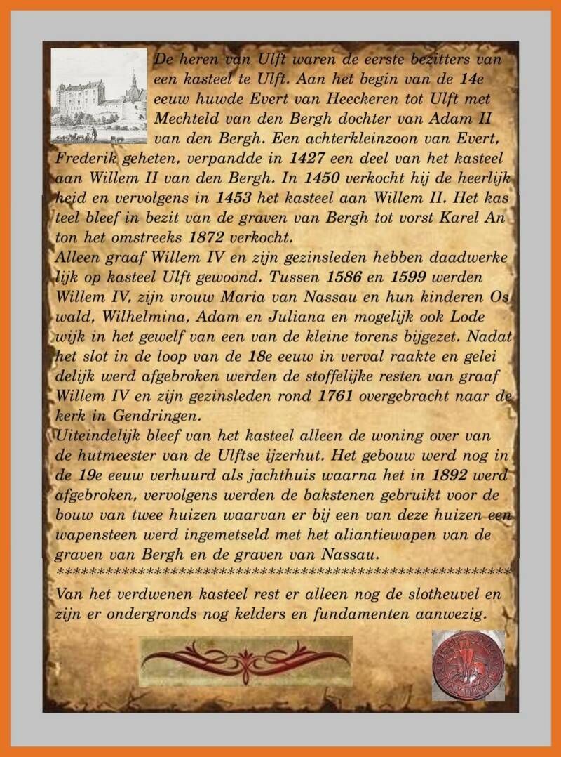Het verdwenen Kasteel van Ulft - Gesticht ca. 1326 - Gesloopt in het jaar 1892 - Resteert; boerderijtje op een heuvel - Privè terrein.